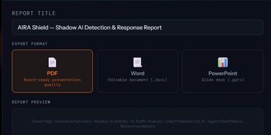 AIRA continuously identifies approved and shadow AI usage, giving you full visibility into risk, policy violations, and unauthorized data access.